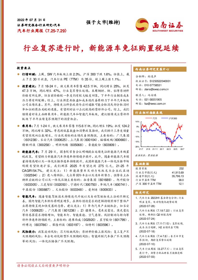 西南证券:汽车行业周报:行业复苏进行时,新能源车免征购置税延续.pdf