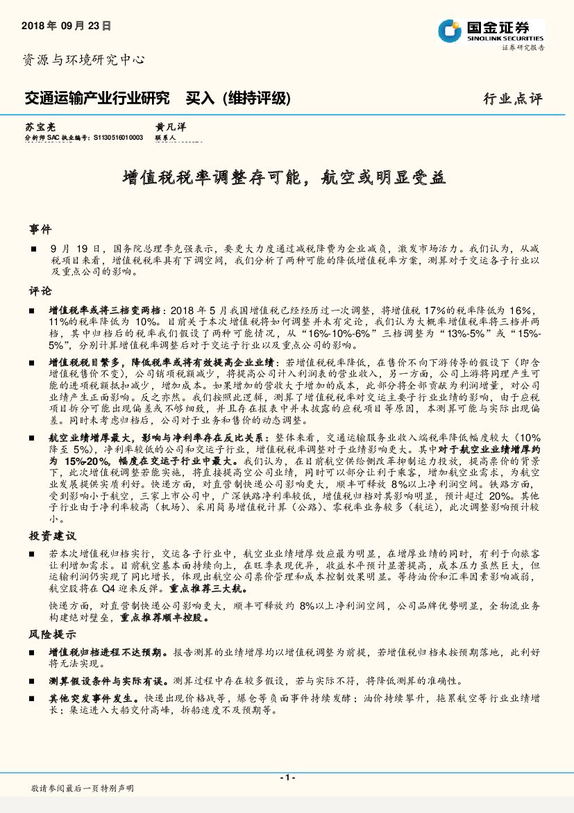 国金证券:交通运输产业行业研究:增值税税率调整存可能,航空或明显受益.pdf
