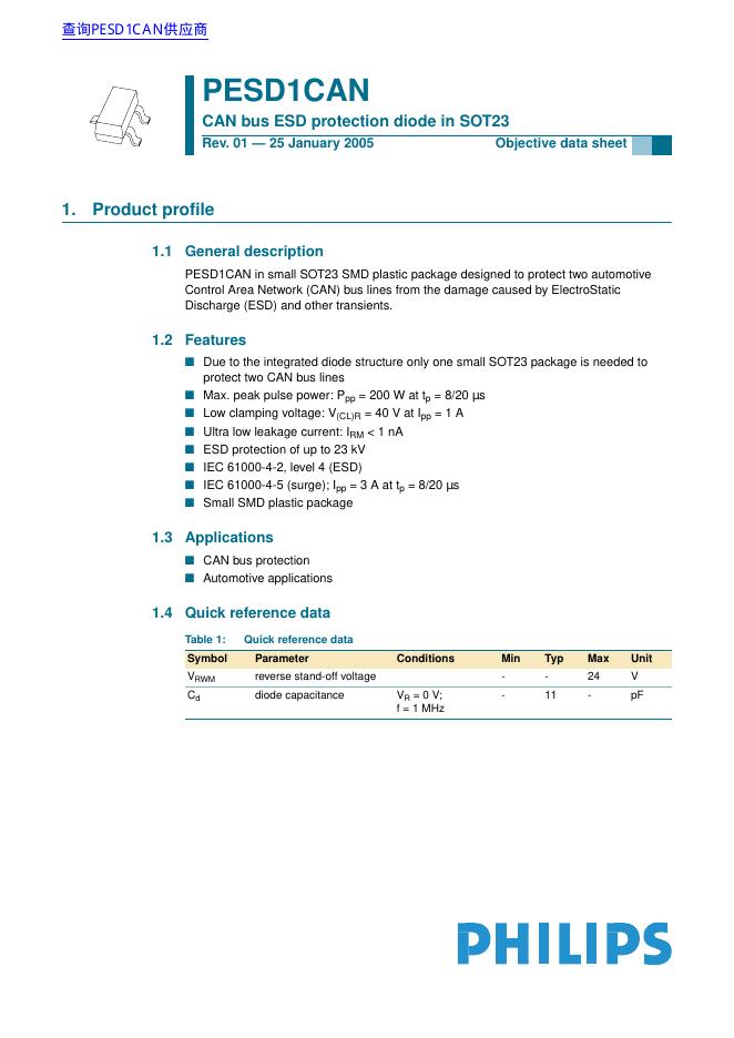 PHILIPS PESD1CAN CAN bus ESD protection diode in SOT23 数据手册.pdf