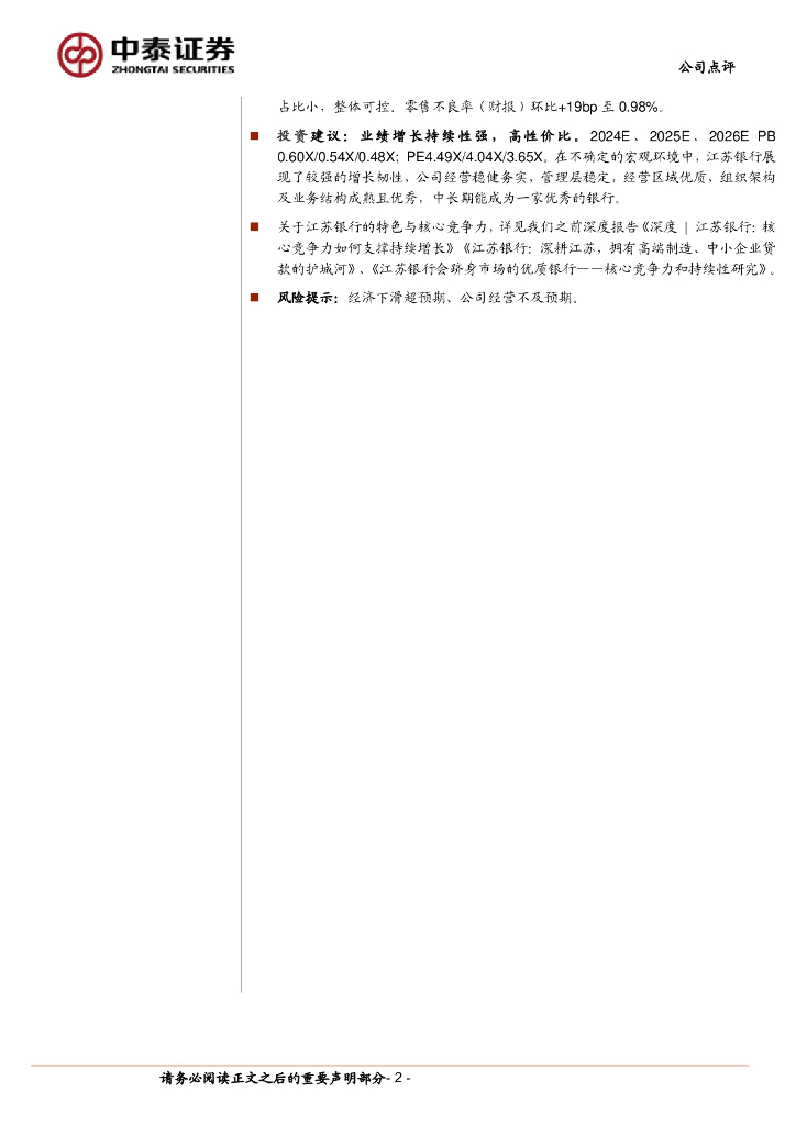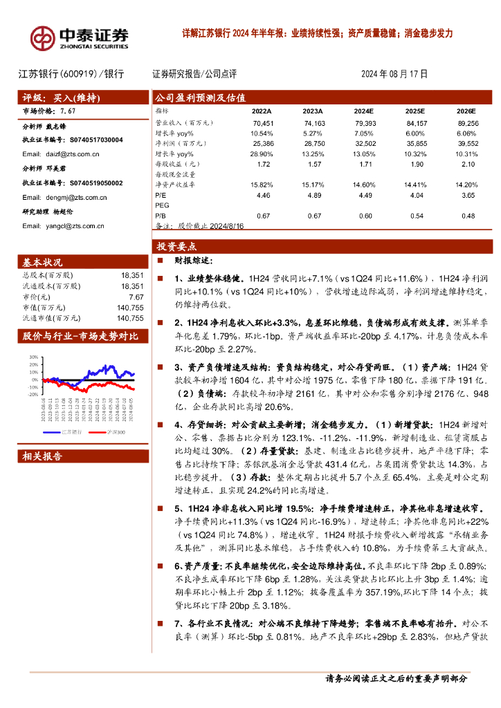 中泰证券:详解江苏银行2024年半年报:业绩持续性强;资产质量稳健;消金稳步发力.pdf