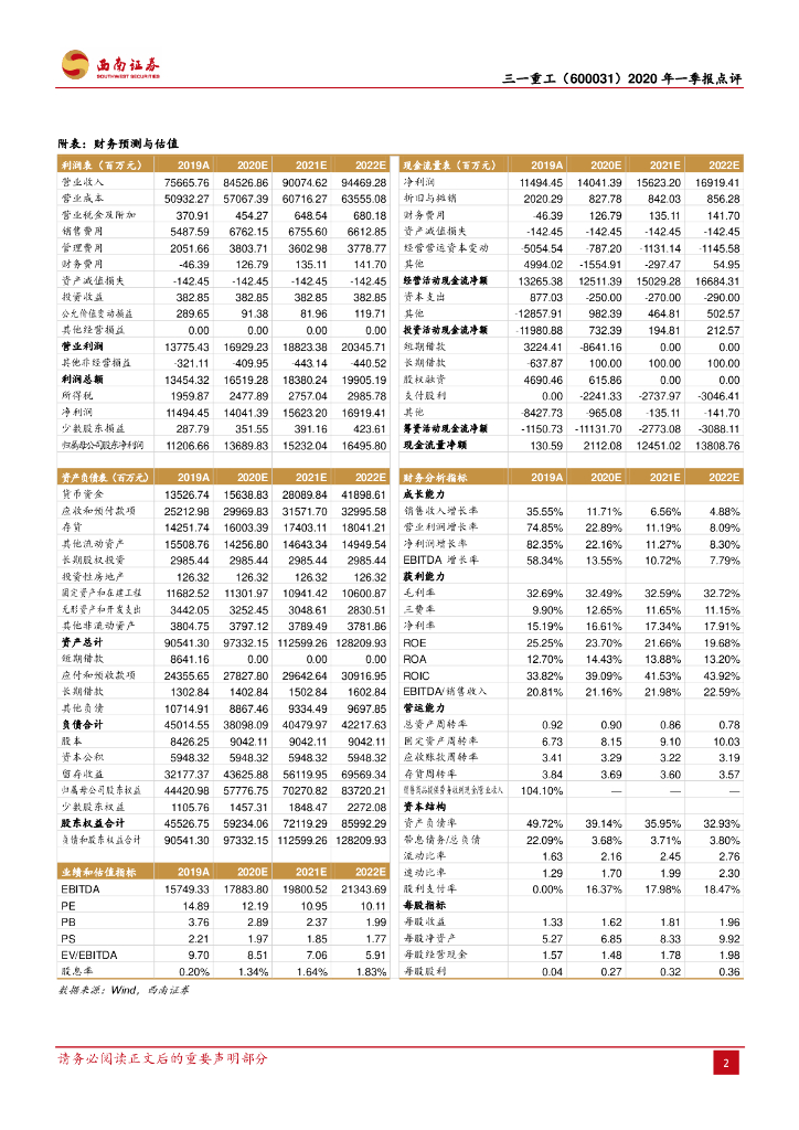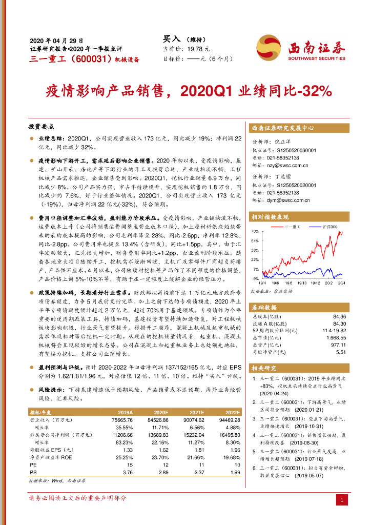 西南证券:三一重工(600031)-疫情影响产品销售,2020Q1业绩同比-32%.pdf