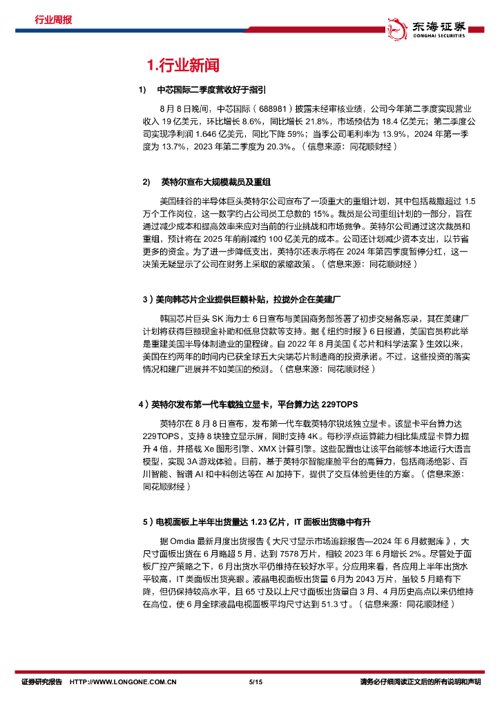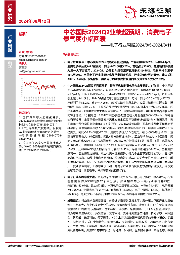 东海证券:电子行业周报:中芯国际2024Q2业绩超预期,消费电子景气度小幅回暖.pdf