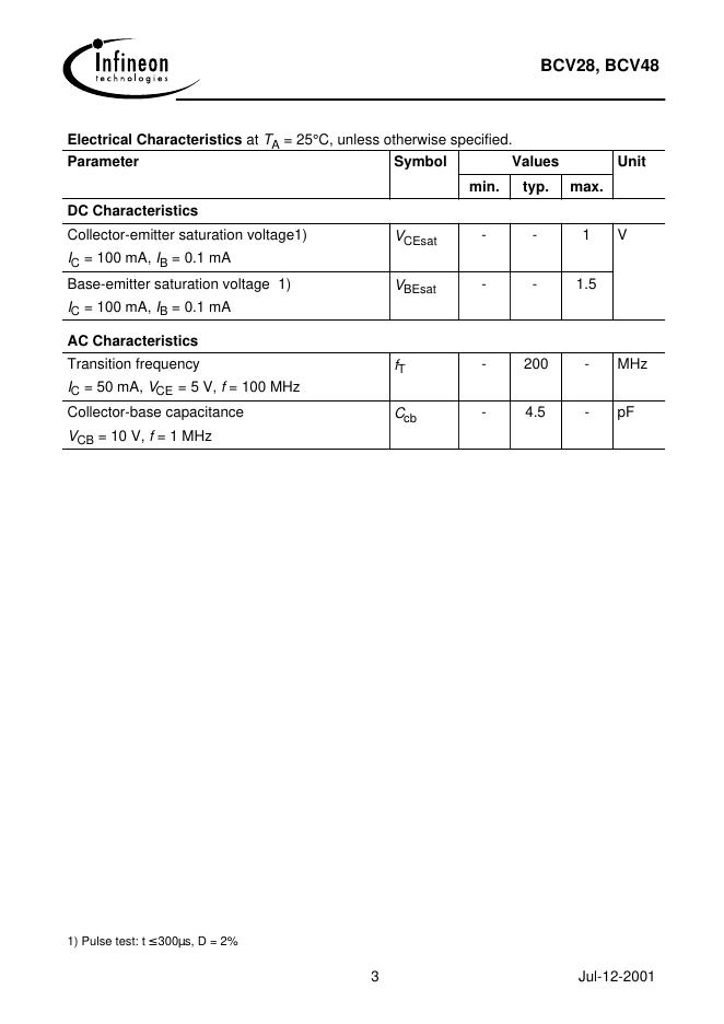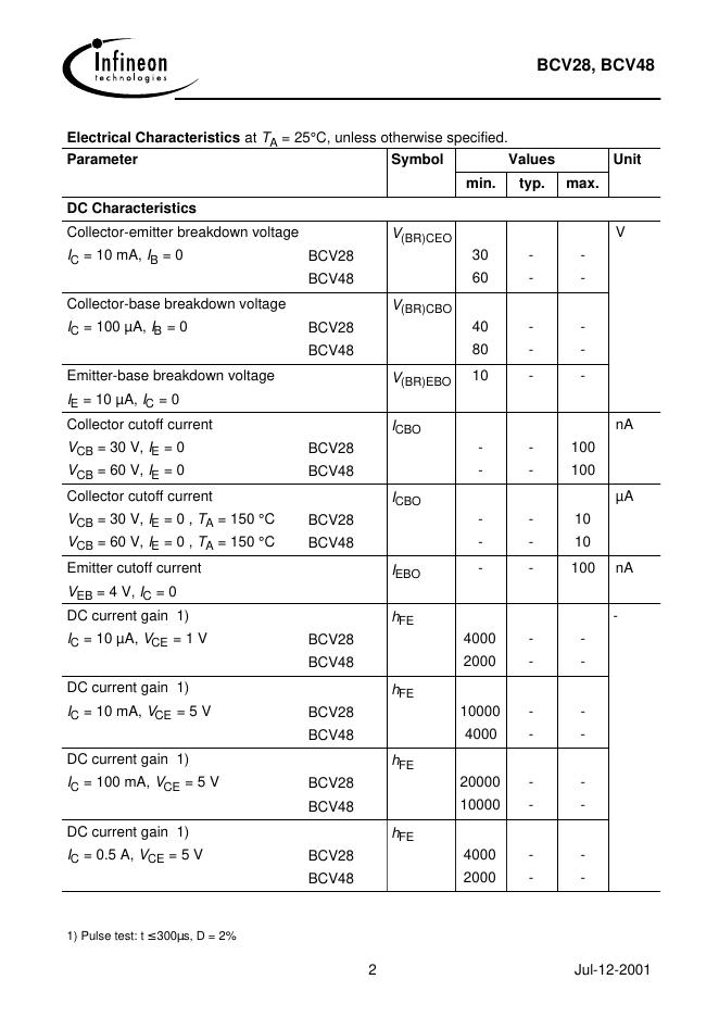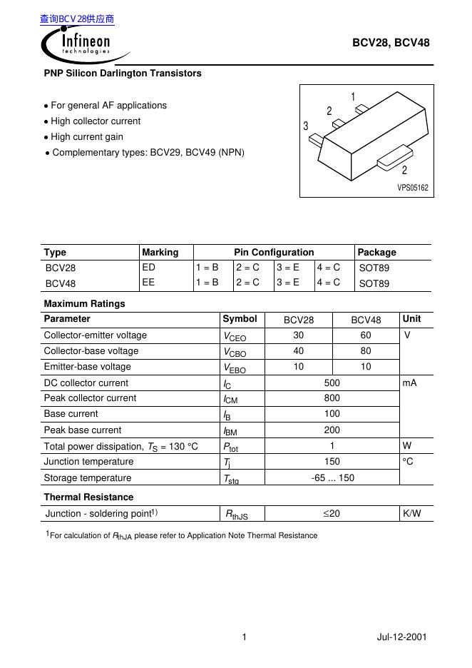 infineon BCV28, BCV48 NPN Silicon Darlington Transistors 数据手册.pdf