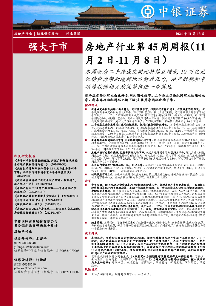 中银证券:房地产行业第45周周报:本周新房二手房成交同比持续正增长,10万亿元化债资源帮助缓解地方财政压力,地产财税和专项债收储相关政策等待进一步落地.pdf
