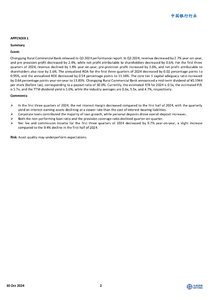 海通国际:24Q3渝农商行业绩点评:Q3净息差企稳源于成本管控,不良率环比下降.pdf