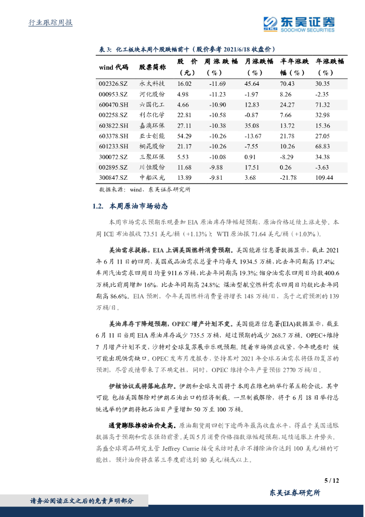 东吴证券:化工行业2021年6月第三周周报:原油价格不断走高,有机硅板块热度持续.pdf