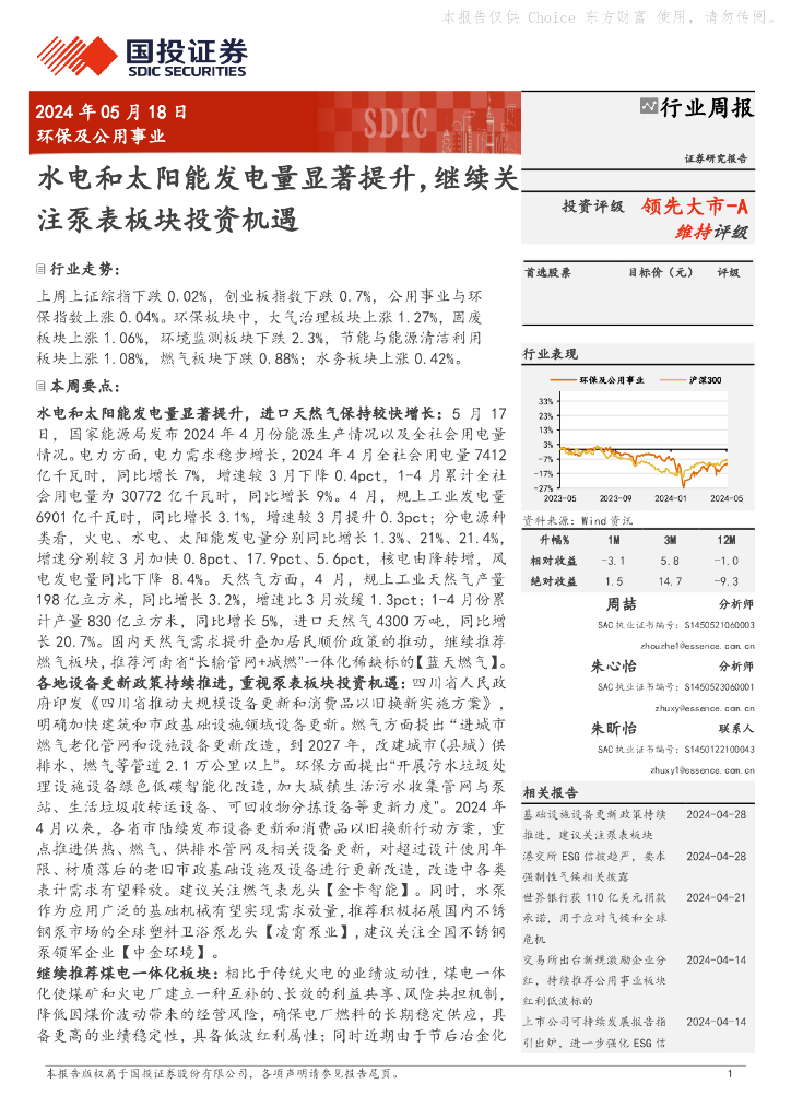 国投证券:环保及公用事业行业周报:水电和太阳能发电量显著提升,继续关注泵表板块投资机遇.pdf