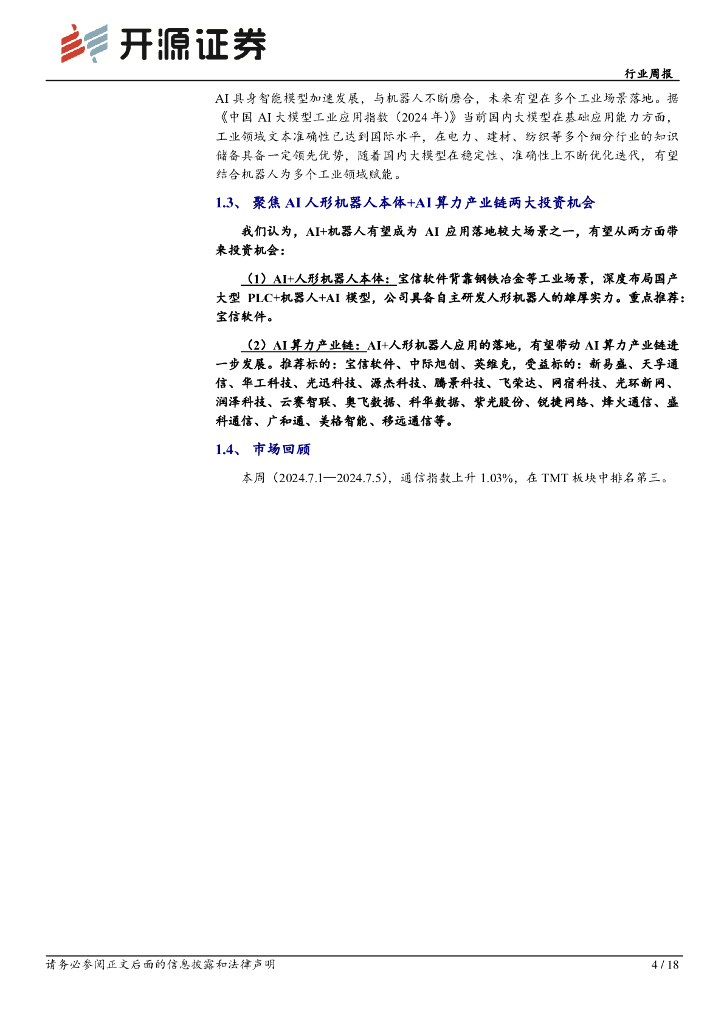 开源证券:通信行业周报:重视AI人形机器人本体+AI算力产业链投资机会.pdf
