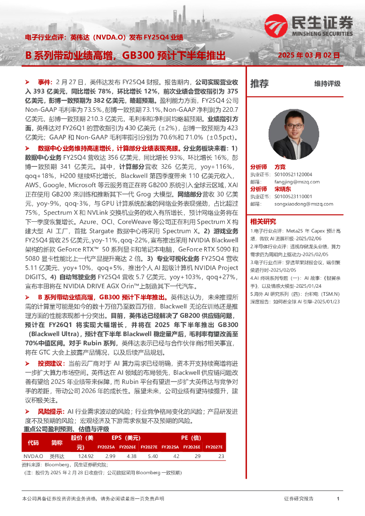 民生证券:电子行业点评:英伟达(NVDA.O)发布FY25Q4业绩-B系列带动业绩高增,GB300预计下半年推出.pdf