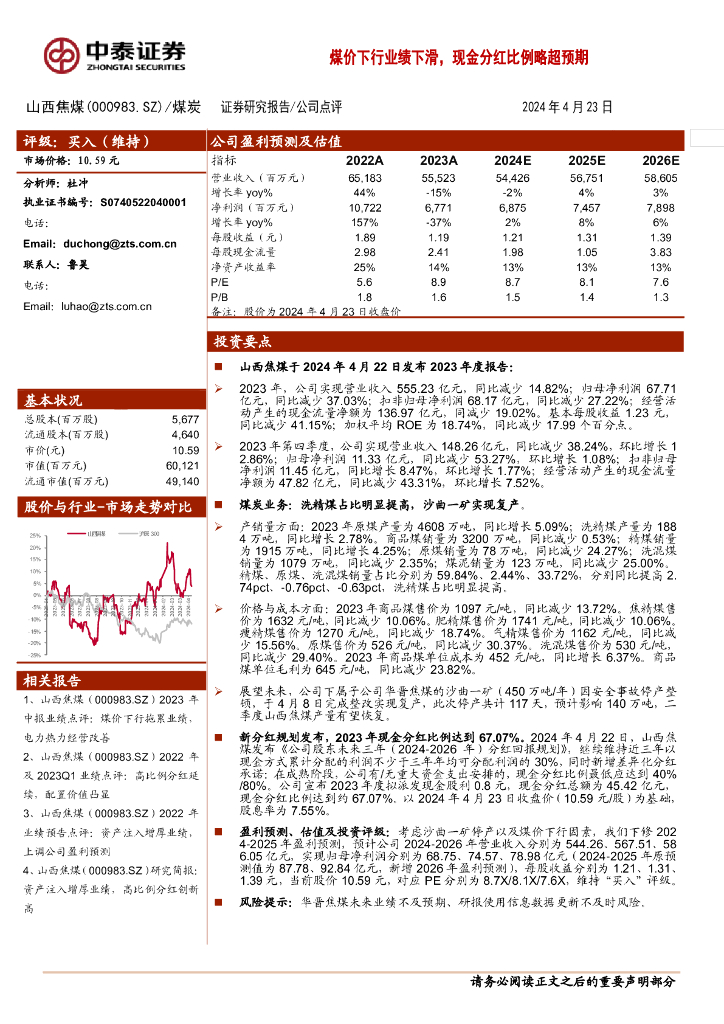 中泰证券:山西焦煤(000983)-煤价下行业绩下滑,现金分红比例略超预期.pdf