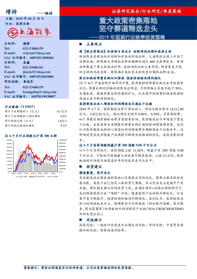 上海证券:2019年医药行业秋季投资策略:重大政策密集落地 坚守赛道精选龙头.pdf