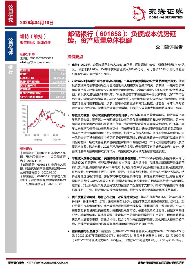 东海证券:邮储银行(601658)-公司简评报告:负债成本优势延续,资产质量总体稳健.pdf