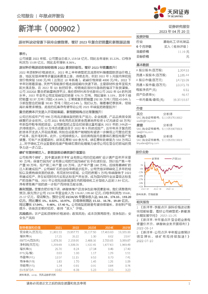 天风证券:新洋丰(000902)-原材料波动背景下保持业绩微增,看好2023年复合肥销量和新能源进展.pdf