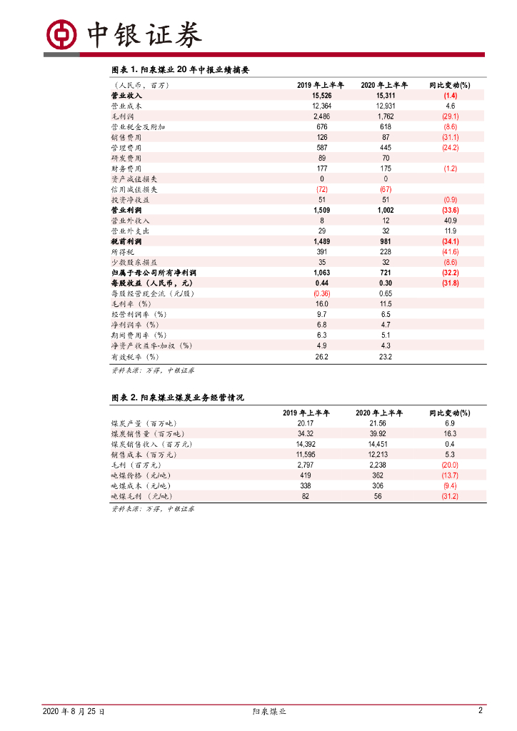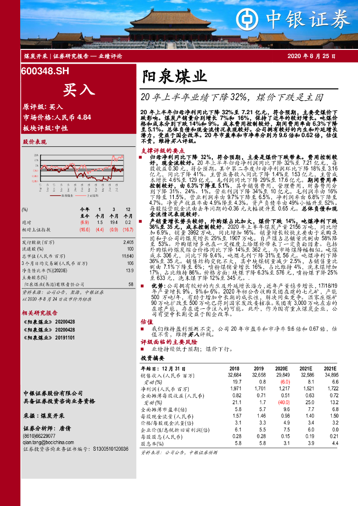 中银证券:阳泉煤业(600348)-20年上半年业绩下降32%,煤价下跌是主因.pdf