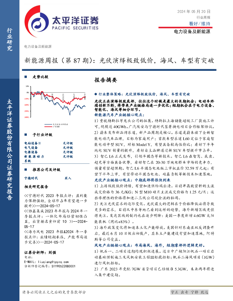 太平洋证券:电力设备及新能源行业新能源周报(第87期):光伏演绎极致低价,海风、车型有突破.pdf
