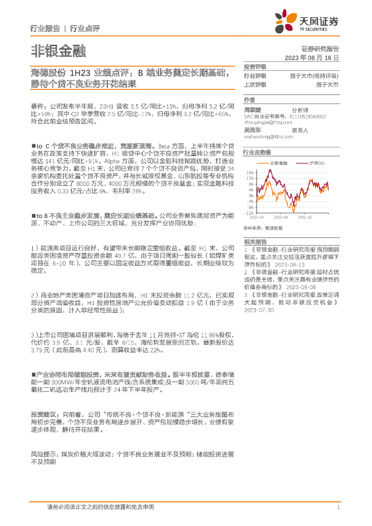 天风证券:非银金融:海德股份1H23业绩点评:B端业务奠定长期基础,静待个贷不良业务开花结果.pdf
