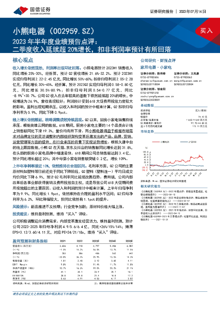 国信证券:小熊电器(002959)-2023年半年度业绩预告点评:二季度收入延续超20%增长,扣非利润率预计有所回落.pdf