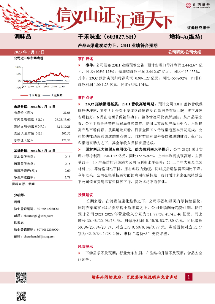 山西证券:千禾味业(603027)-产品&渠道双助力下,23H1业绩符合预期.pdf