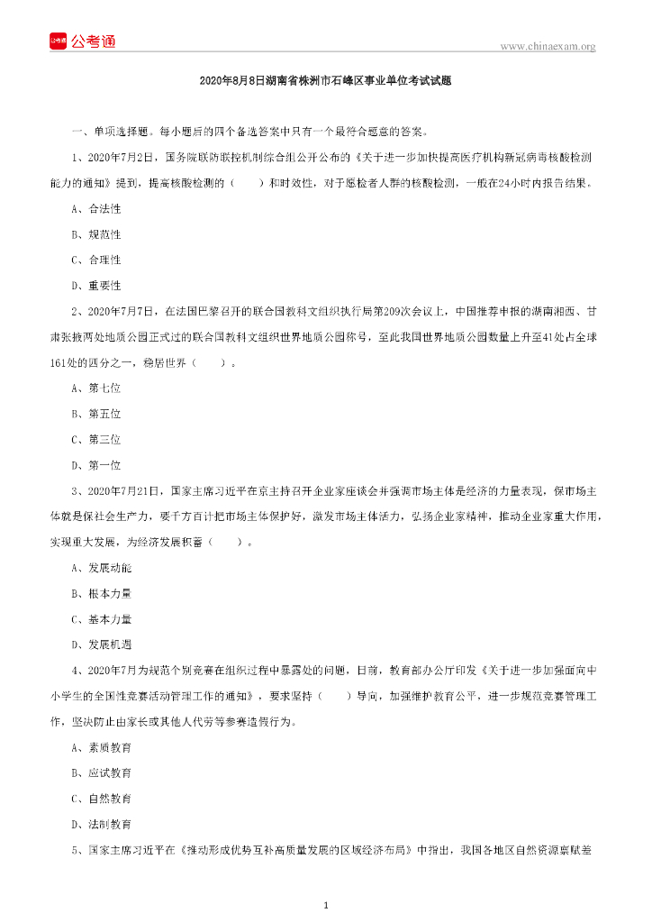 2020年8月8日湖南省株洲市石峰区事业单位考试试题.pdf