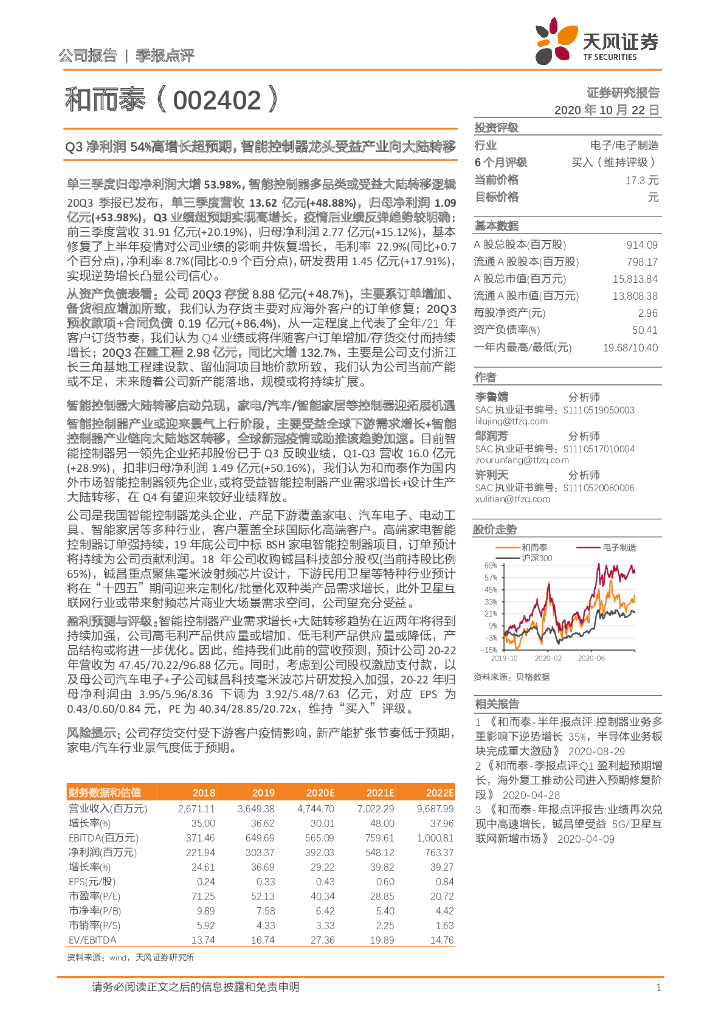 天风证券:和而泰(002402)-Q3净利润54%高增长超预期,智能控制器龙头受益产业向大陆转移.pdf