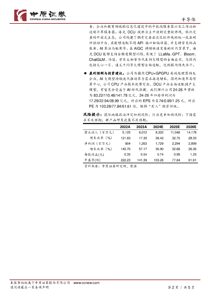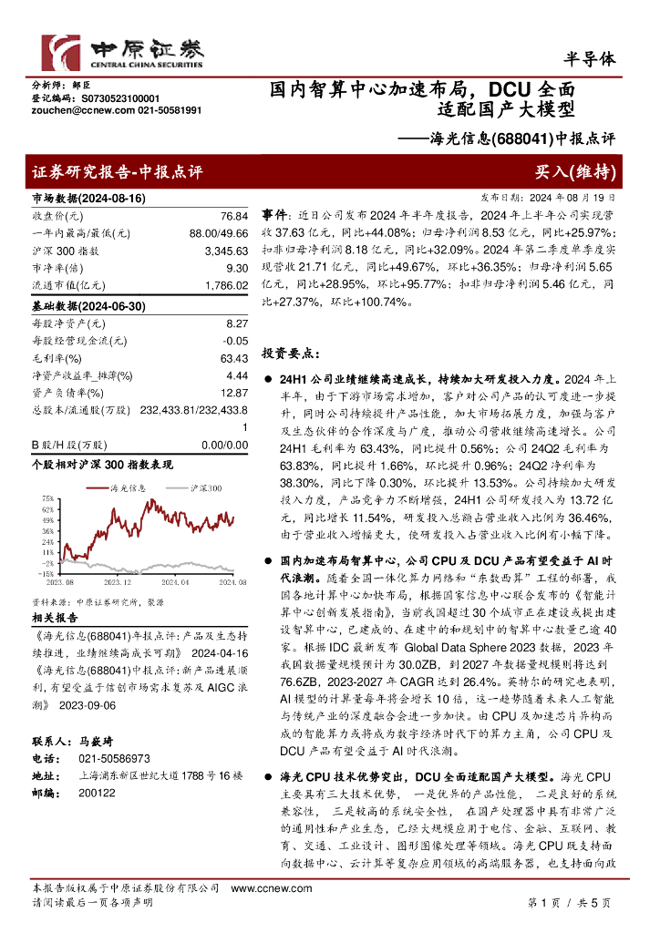 中原证券:海光信息(688041)-中报点评,国内智算中心加速布局,DCU全面适配国产大模型.pdf