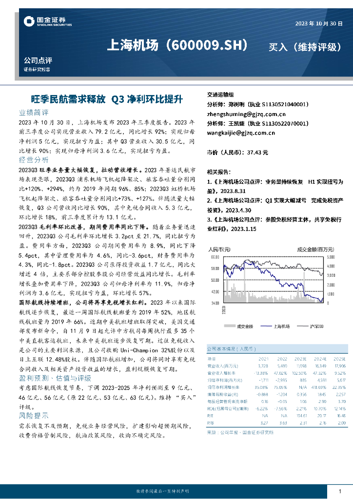 国金证券:上海机场(600009)-旺季民航需求释放,Q3净利环比提升.pdf