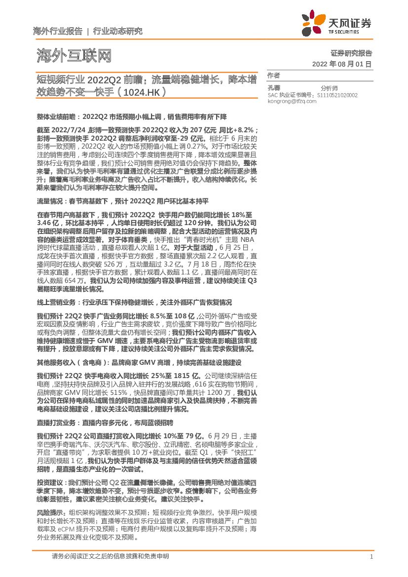 天风证券:短视频行业2022Q2前瞻:流量端稳健增长,降本增效趋势不变—快手.pdf