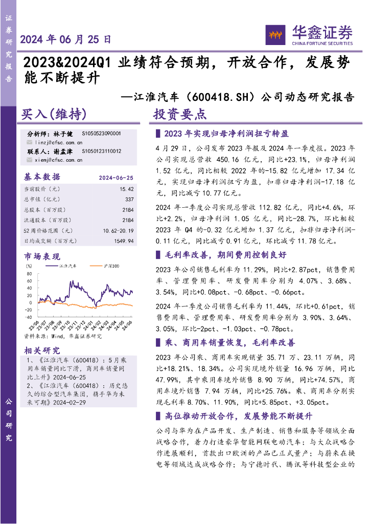 华鑫证券:江淮汽车(600418)-公司动态研究报告:2023&2024Q1业绩符合预期,开放合作,发展势能不断提升.pdf
