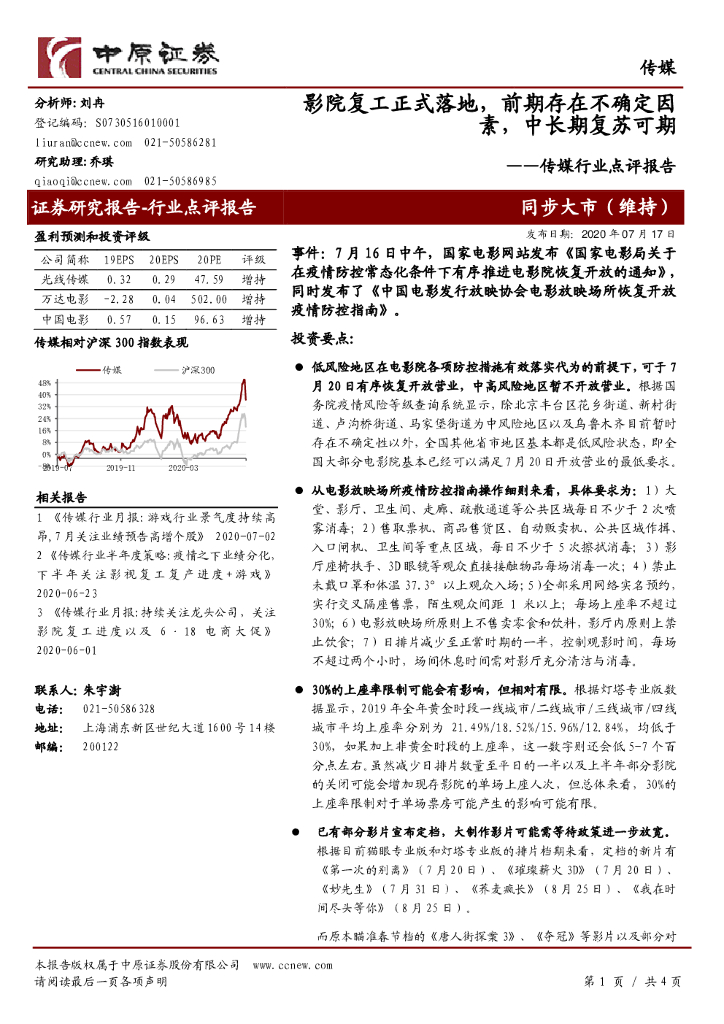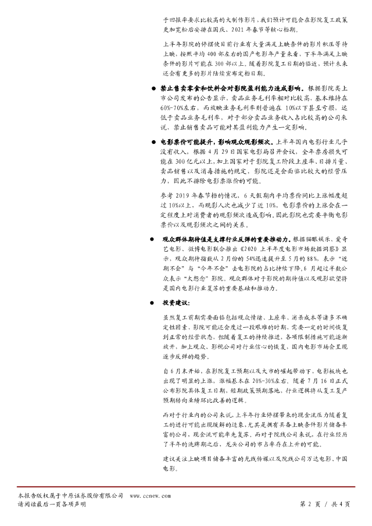 中原证券:传媒行业点评报告:影院复工正式落地,前期存在不确定因素,中长期复苏可期.pdf