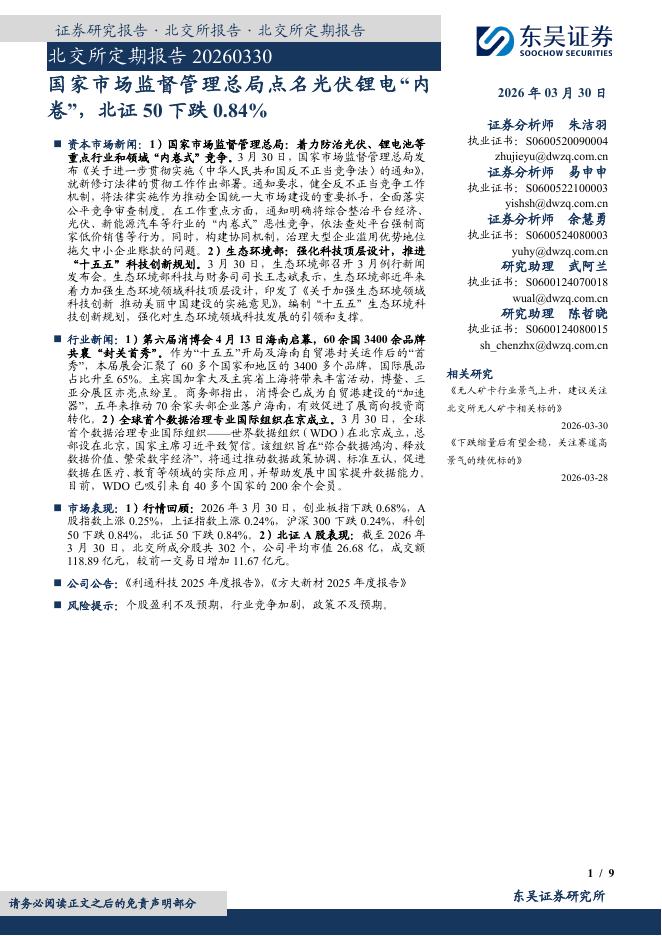 东吴证券:北交所定期报告:国家市场监督管理总局点名光伏锂电“内卷”,北证50下跌0.84%-260331.pdf