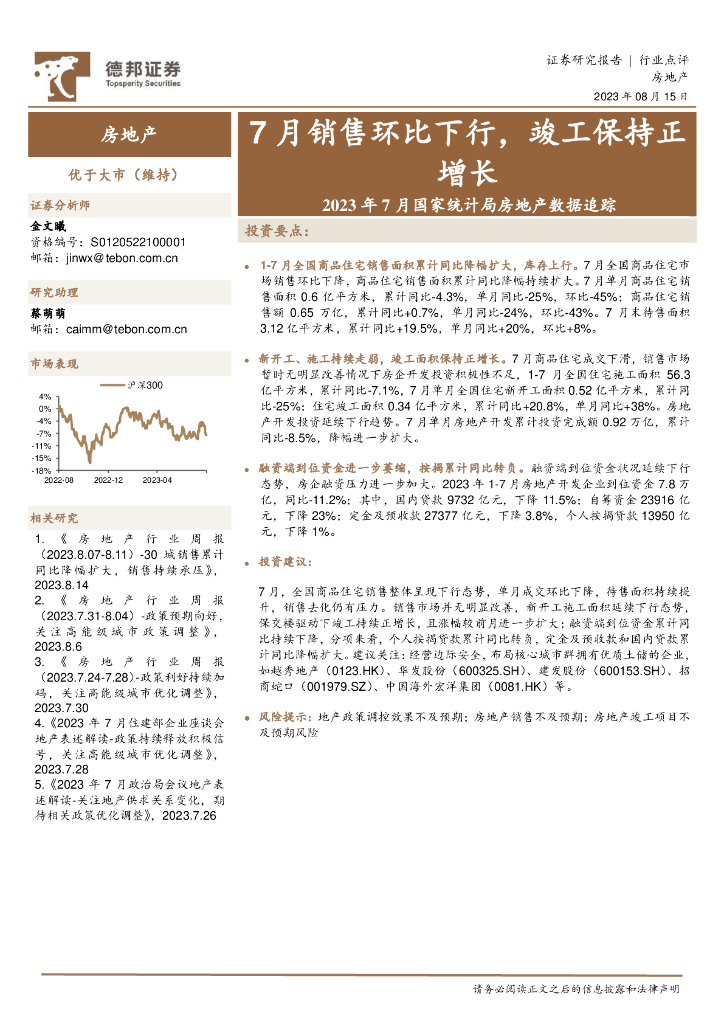德邦证券:房地产2023年7月国家统计局房地产数据追踪:7月销售环比下行,竣工保持正增长.pdf
