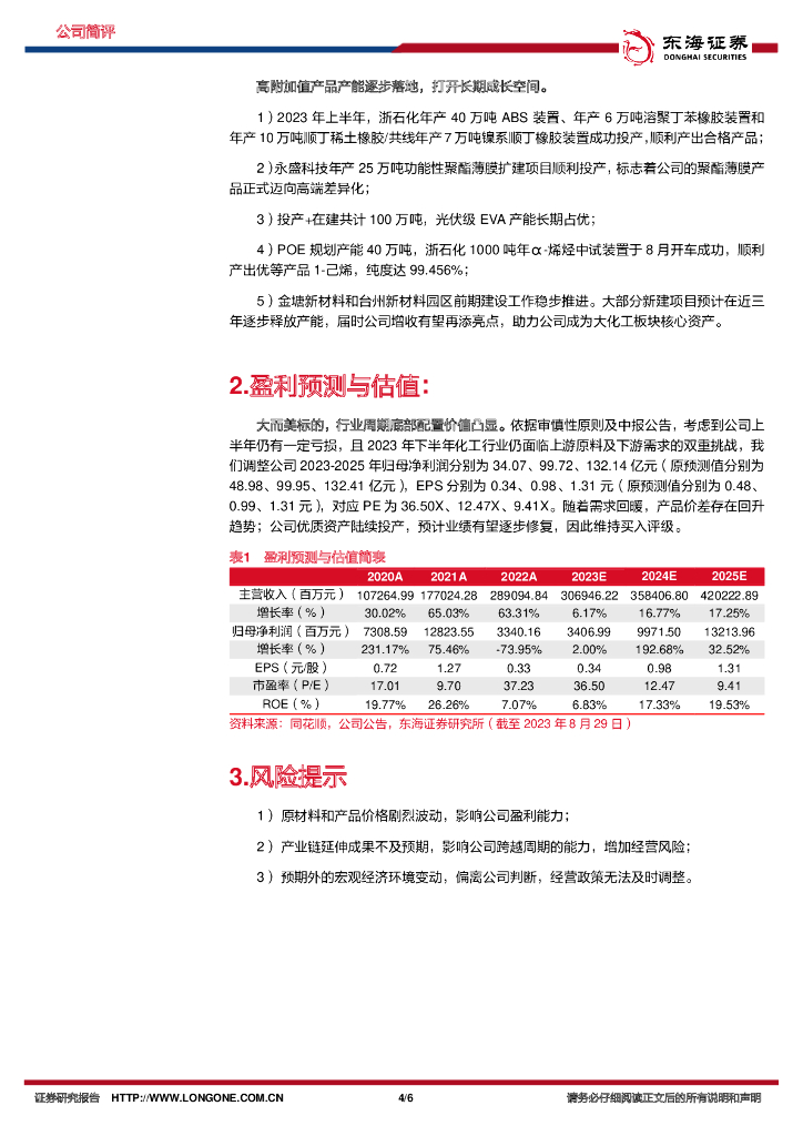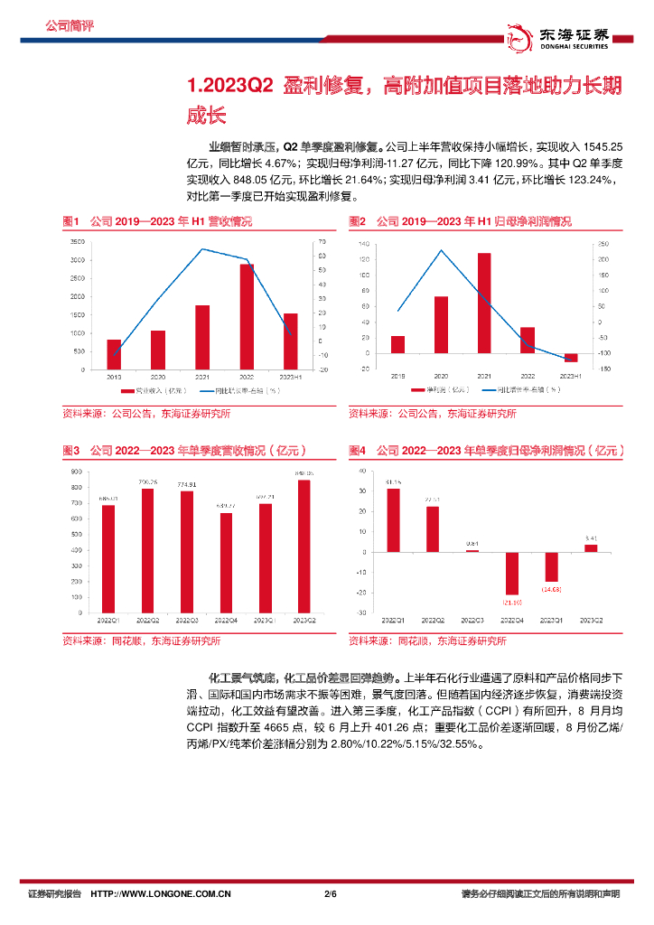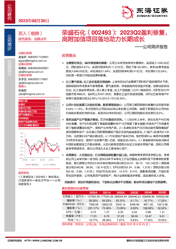 东海证券:荣盛石化(002493)-公司简评报告:2023Q2盈利修复,高附加值项目落地助力长期成长.pdf