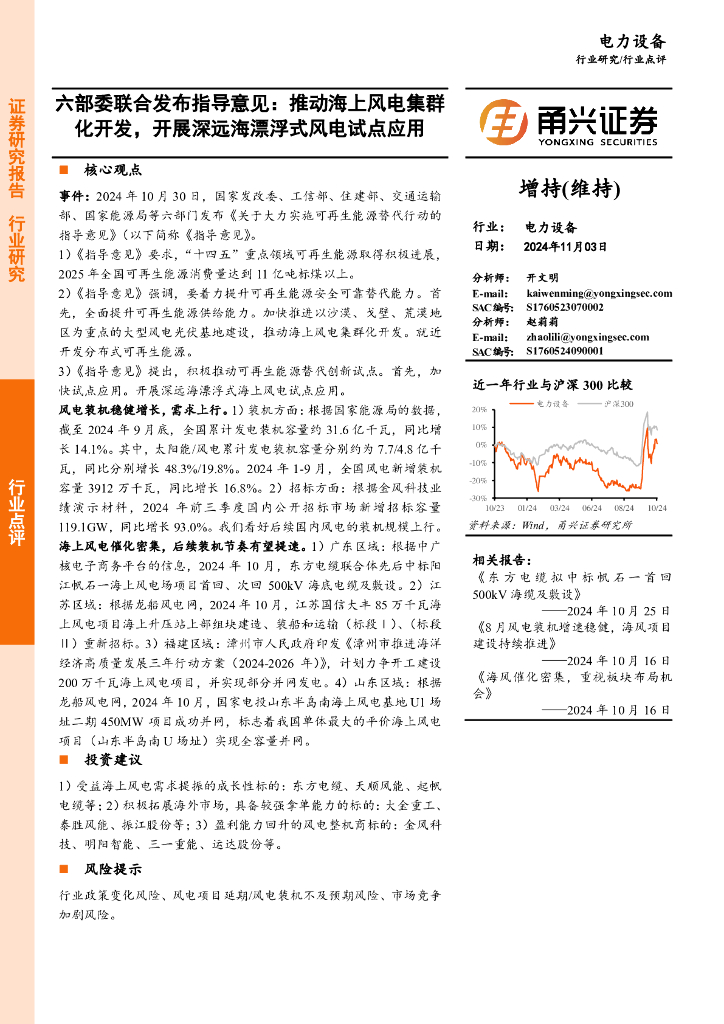 甬兴证券:电力设备:六部委联合发布指导意见:推动海上风电集群化开发,开展深远海漂浮式风电试点应用.pdf