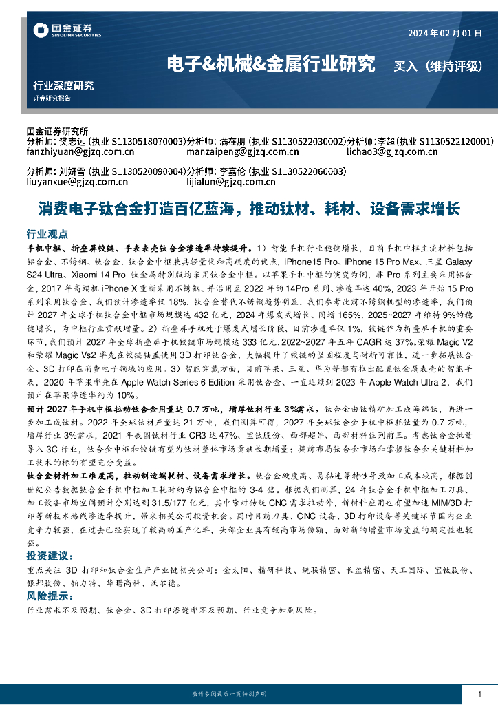 国金证券:电子&机械&金属行业研究:消费电子钛合金打造百亿蓝海,推动钛材、耗材、设备需求增长.pdf
