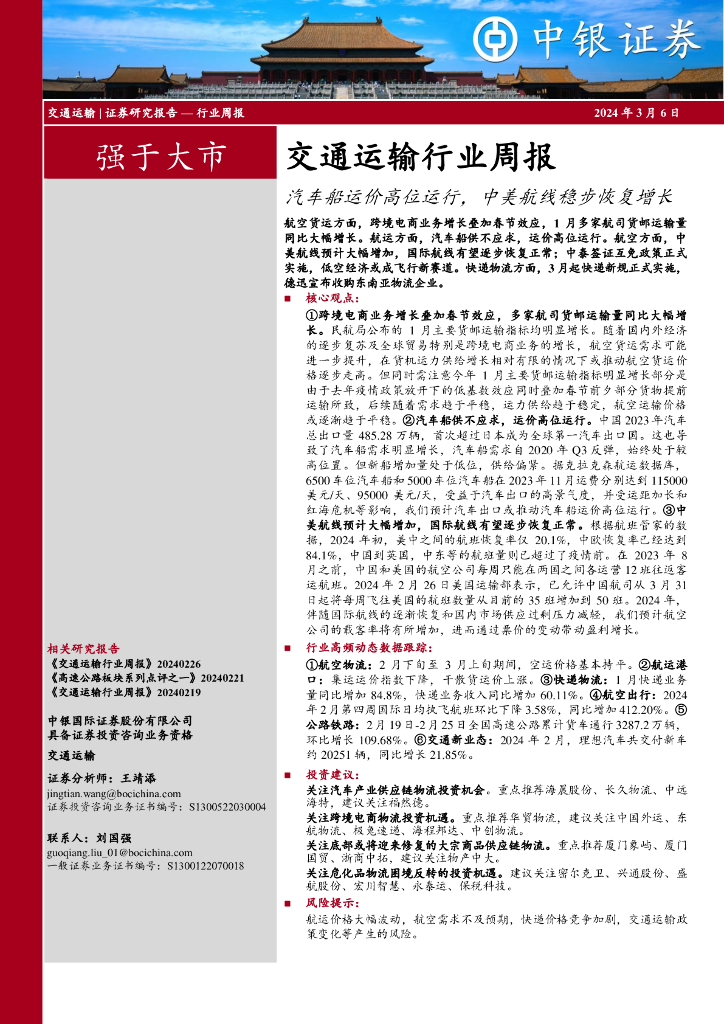 中银证券:交通运输行业周报:汽车船运价高位运行,中美航线稳步恢复增长.pdf
