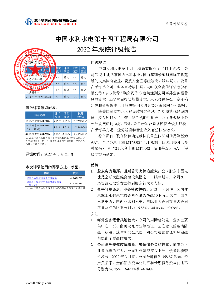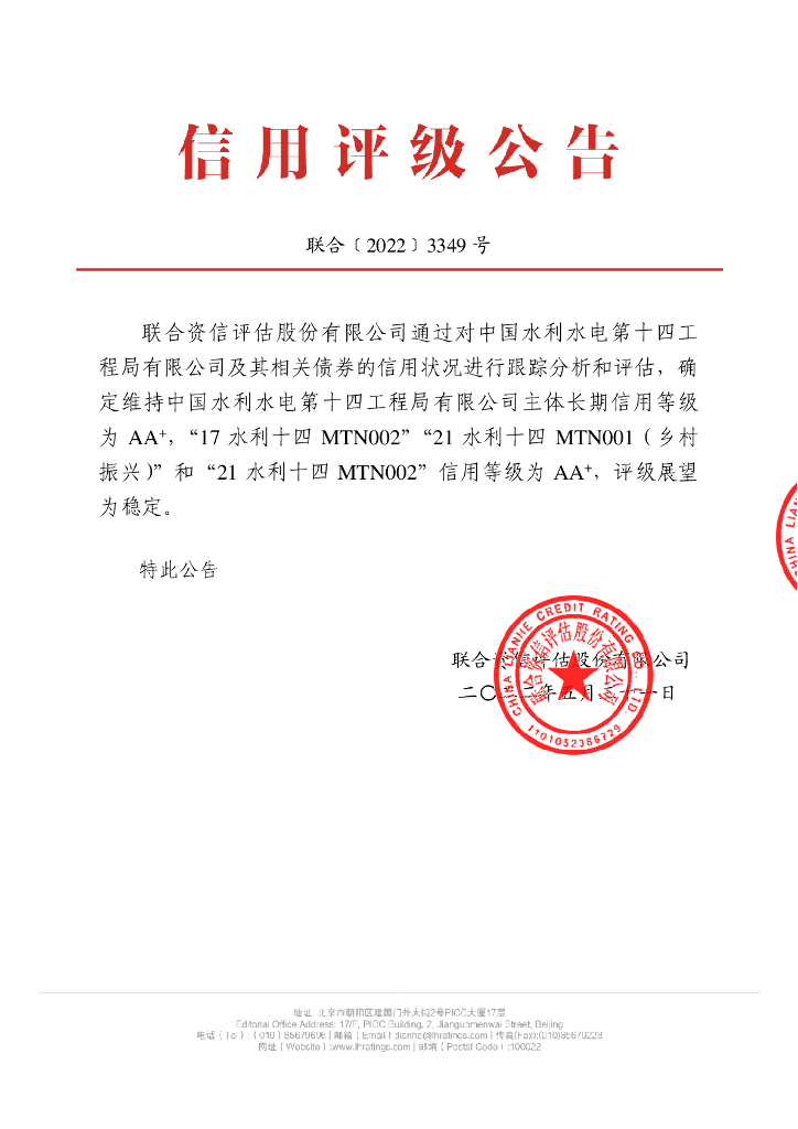 联合资信:中国水利水电第十四工程局有限公司2022年跟踪评级报告.pdf