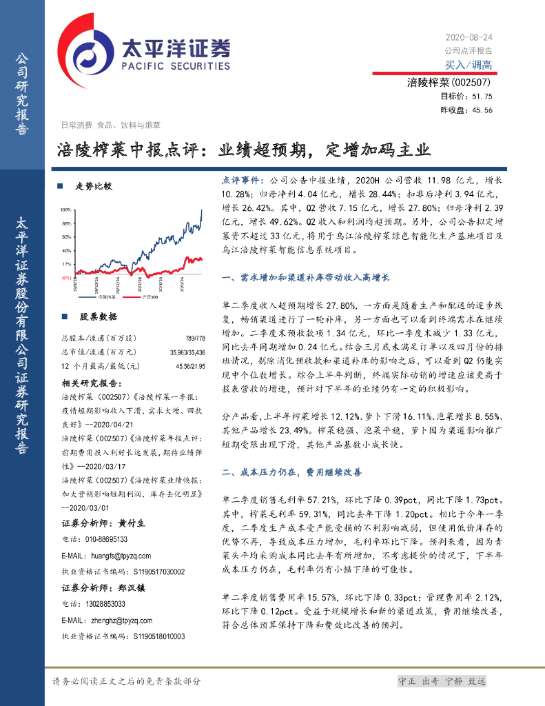 太平洋证券:涪陵榨菜中报点评:业绩超预期,定增加码主业.pdf