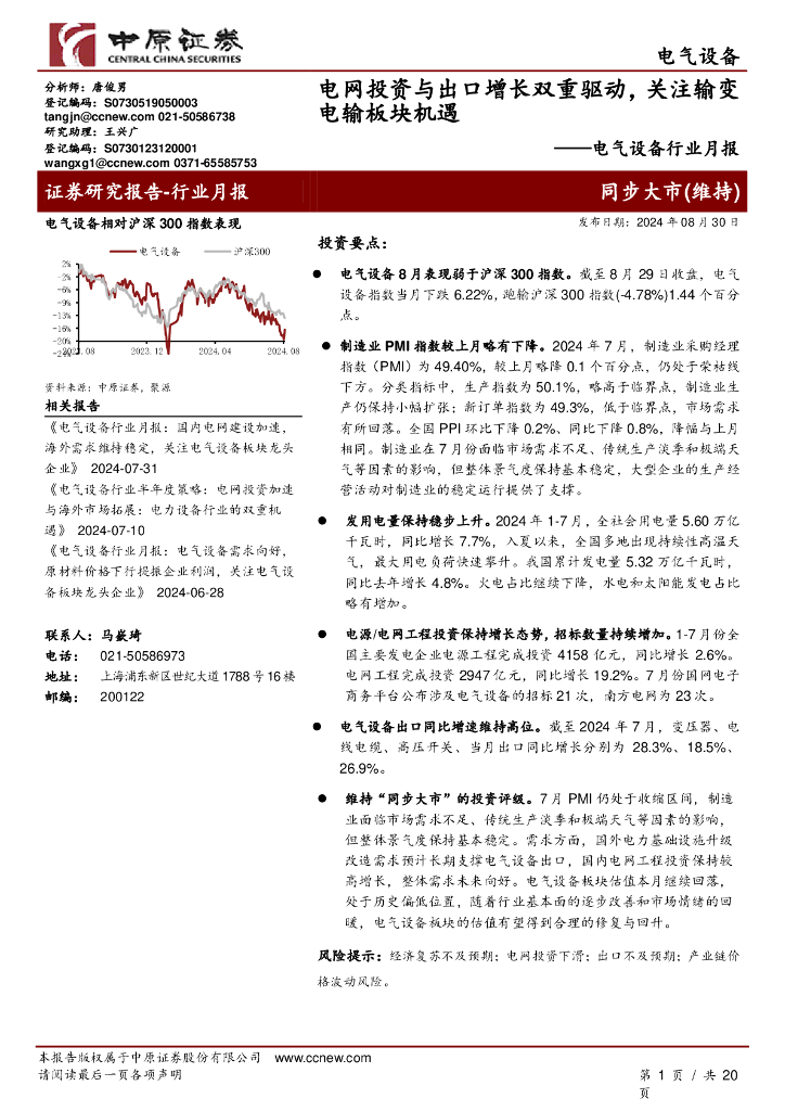中原证券:电气设备行业月报:电网投资与出口增长双重驱动,关注输变电输板块机遇.pdf