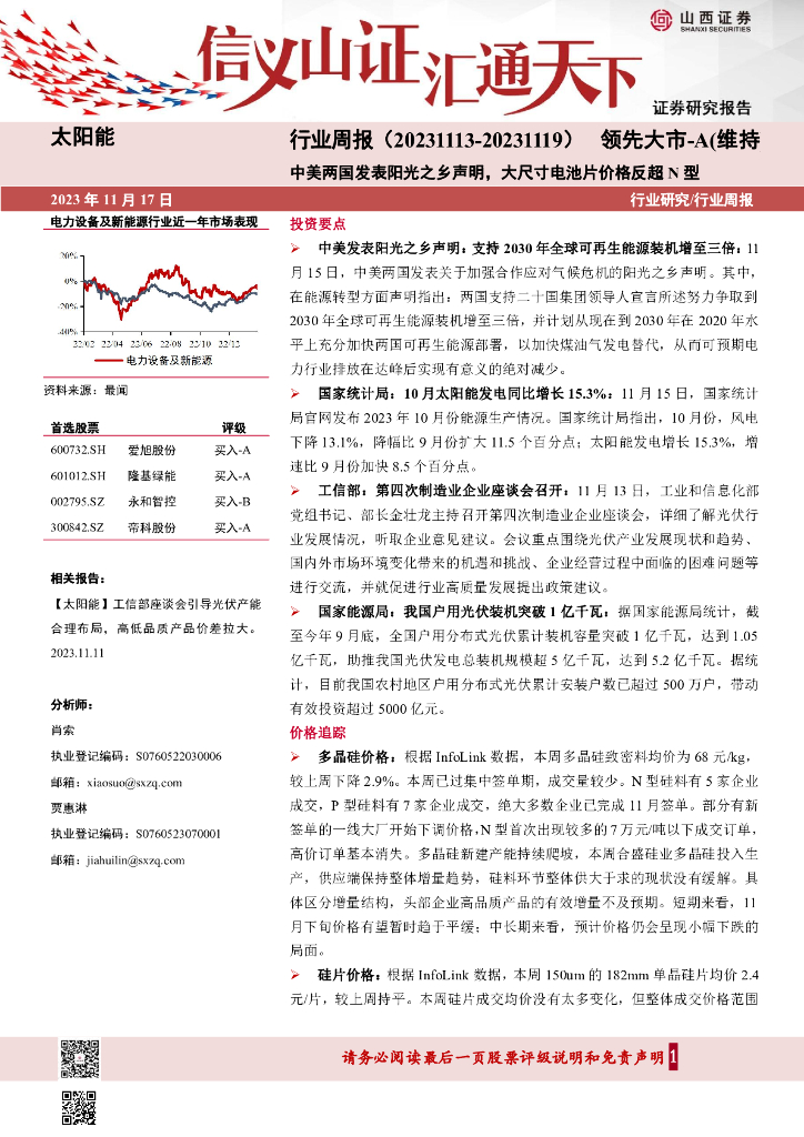 山西证券:太阳能行业周报:中美两国发表阳光之乡声明,大尺寸电池片价格反超N型.pdf