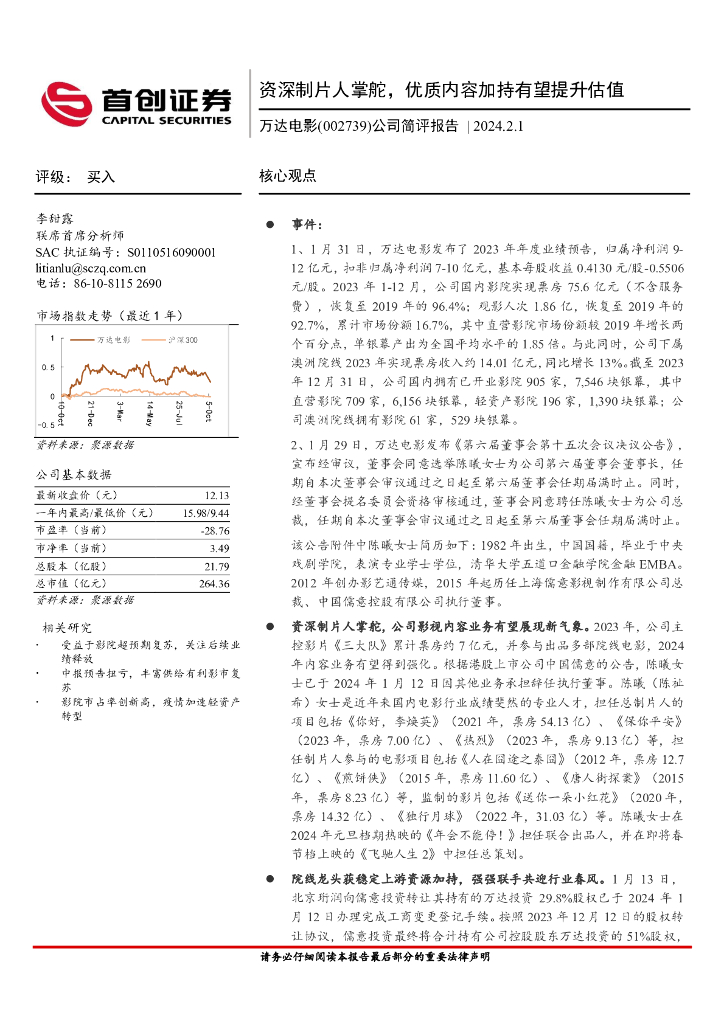 首创证券:万达电影(002739)-公司简评报告:资深制片人掌舵,优质内容加持有望提升估值.pdf