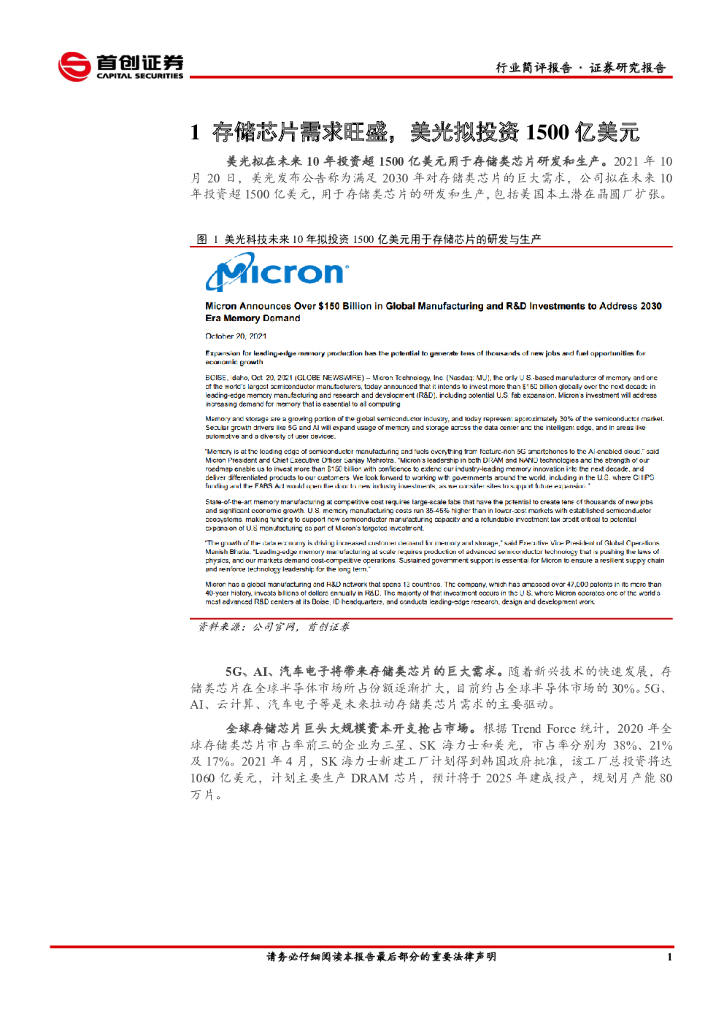 首创证券:电子行业简评报告:存储芯片需求旺盛,美光拟投资1500亿美元.pdf
