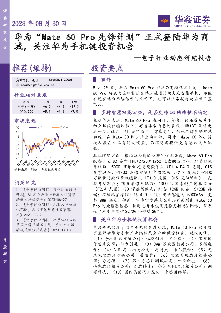华鑫证券:电子行业动态研究报告:华为“Mate 60 Pro先锋计划”正式登陆华为商城,关注华为手机链投资机会.pdf