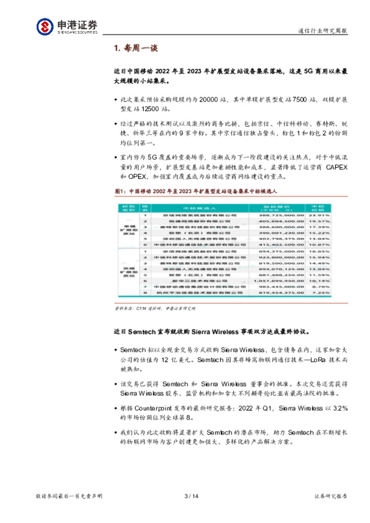 申港证券:通信行业研究周报:中国移动小站集采开标 Semtech拟收购Sierra Wireless.pdf