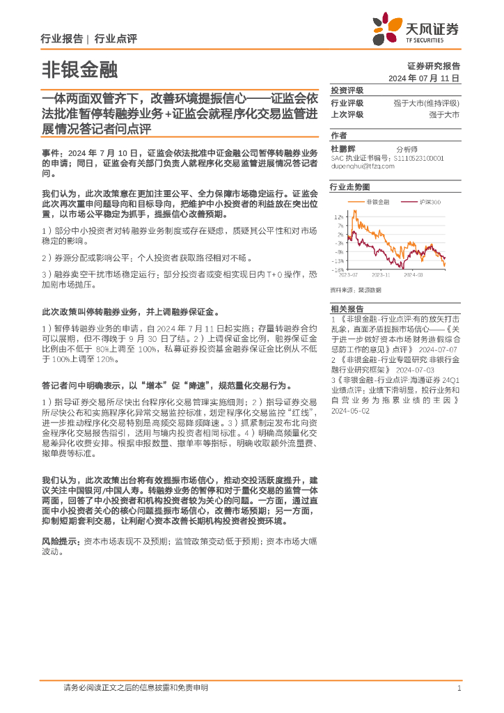 天风证券:非银金融:证监会依法批准暂停转融券业务+证监会就程序化交易监管进展情况答记者问点评-一体两面双管齐下,改善环境提振信心.pdf