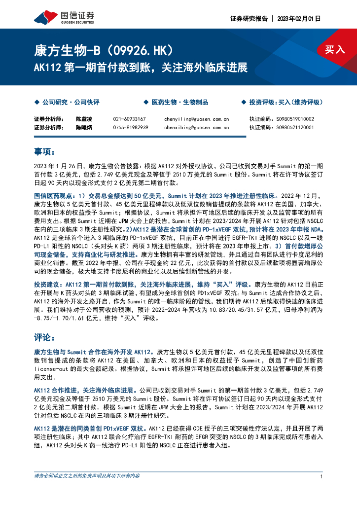 国信证券:康方生物(09926)港股公司研究报告-AK112第一期首付款到账,关注海外临床进展.pdf