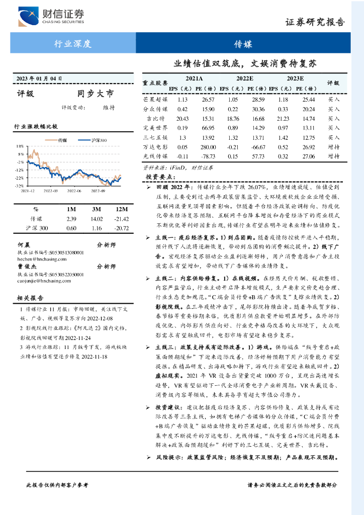 财信证券:传媒行业深度:业绩估值双筑底,文娱消费待复苏.pdf