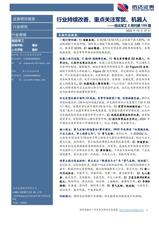 信达证券:军工行业E周刊第199期:行业持续改善,重点关注军贸、机器人.pdf