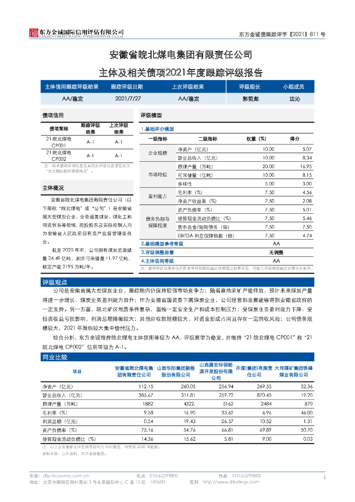 东方金诚:安徽省皖北煤电集团有限责任公司主体及相关债项2021年度跟踪评级报告.pdf