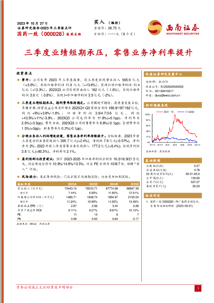 西南证券:国药一致(000028)-2023年三季报点评:三季度业绩短期承压,零售业务净利率提升.pdf