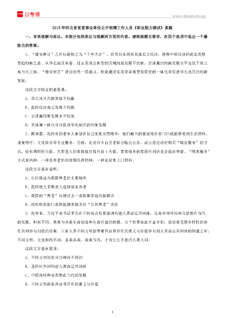 2019年河北省省直事业单位招聘《职业能力测试》真题.pdf